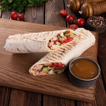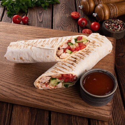 Хрустящий лаваш, сочное мясо свинины приготовленное на мангале, фирменный соус, соус сырный, свежий огурец, помидоры и красный лучок.