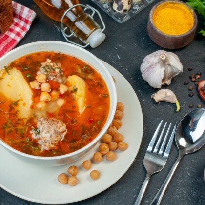 Лук, морковь, картошка, чечевица, вода, соль. Подаётся с гренками и долькой лимона.