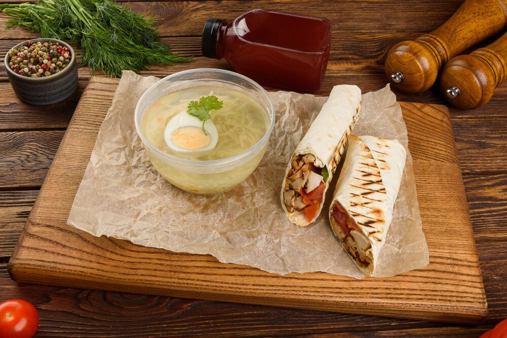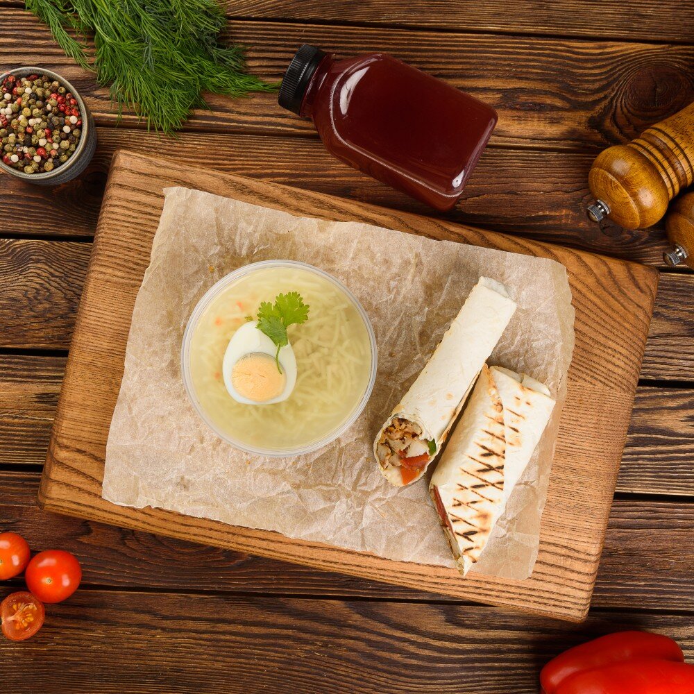 Мини-шаверма сырная (200 гр), куриный супчик (250 гр), морсик на выбор (300 мл)