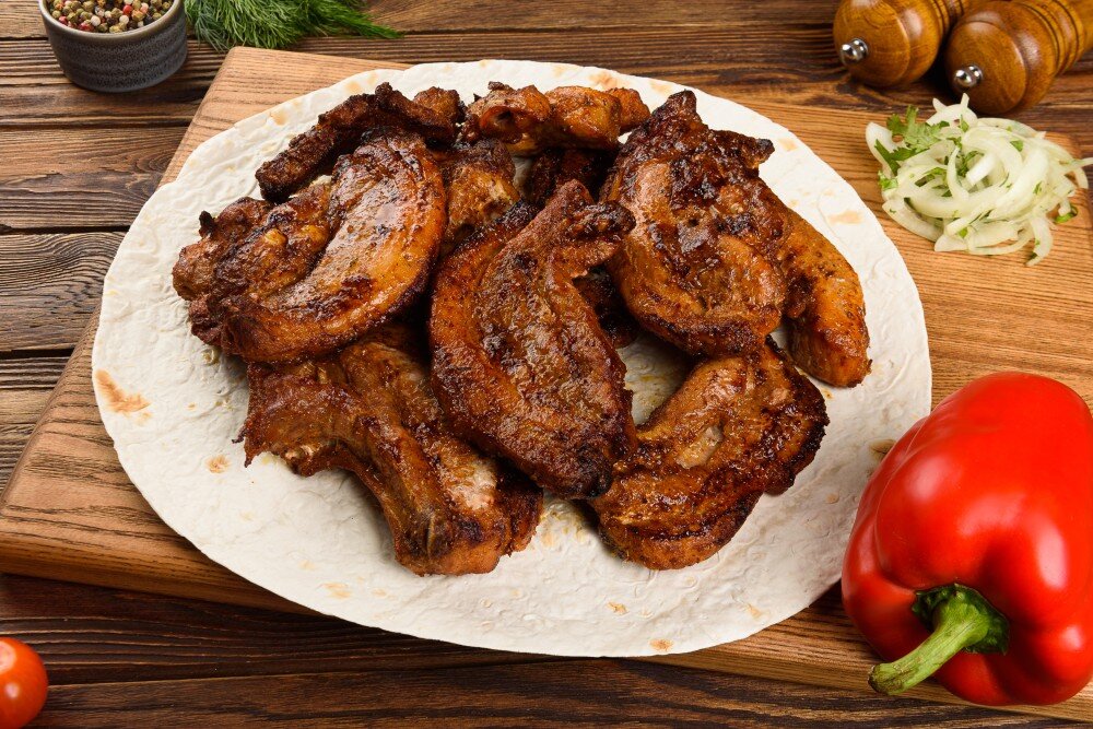 Сочные свиные рёбра в нашем фирменном маринаде. Подаются с луком.