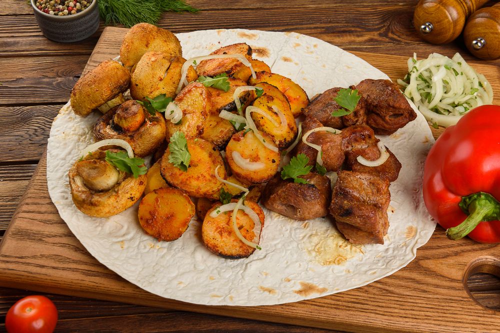 Шашлык из свиной шейки (240 г), картошечка на мангале (200 г), шампиньоны на мангале (200 г), лаваш. Подаётся с маринованным луком.